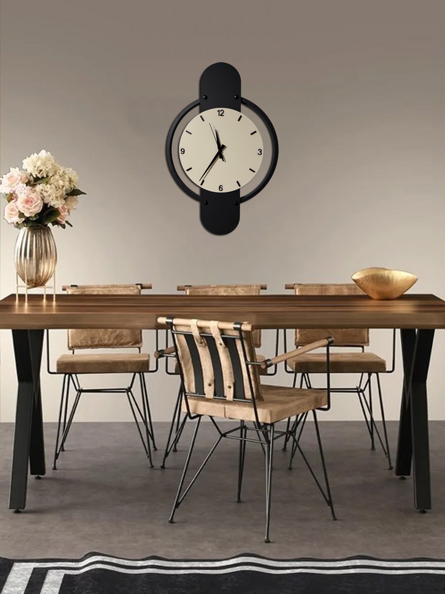 Zarif detayları ve güçlü duruşuyla dikkat çeken Arya Metal Duvar Saati, yaşam alanlarınıza modern bir dokunuş katmak için tasarlandı. Siyah ve antik beyaz renklerin kontrast uyumu, sade dekorasyon anlayışını tamamlayan bir estetik sunarken, DKP demir profili ve 8 mm MDF yüzeyi ile uzun ömürlü kullanım sağlar.