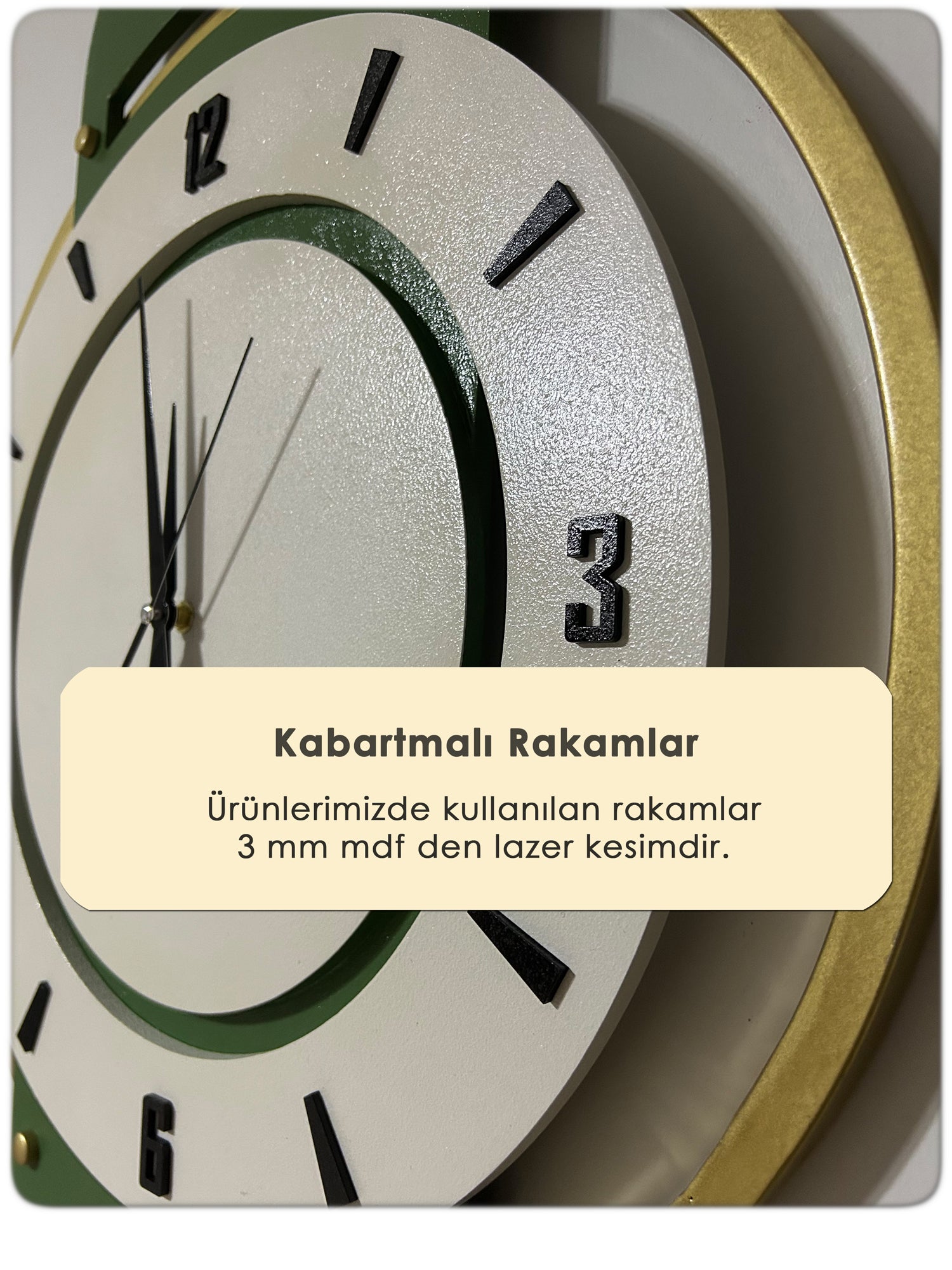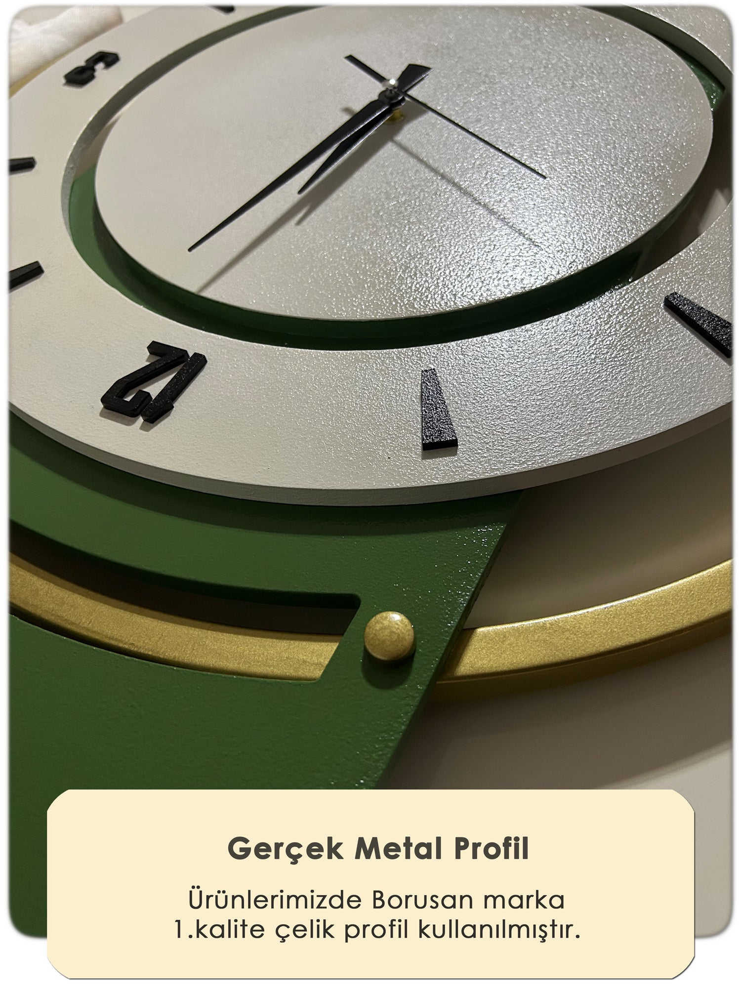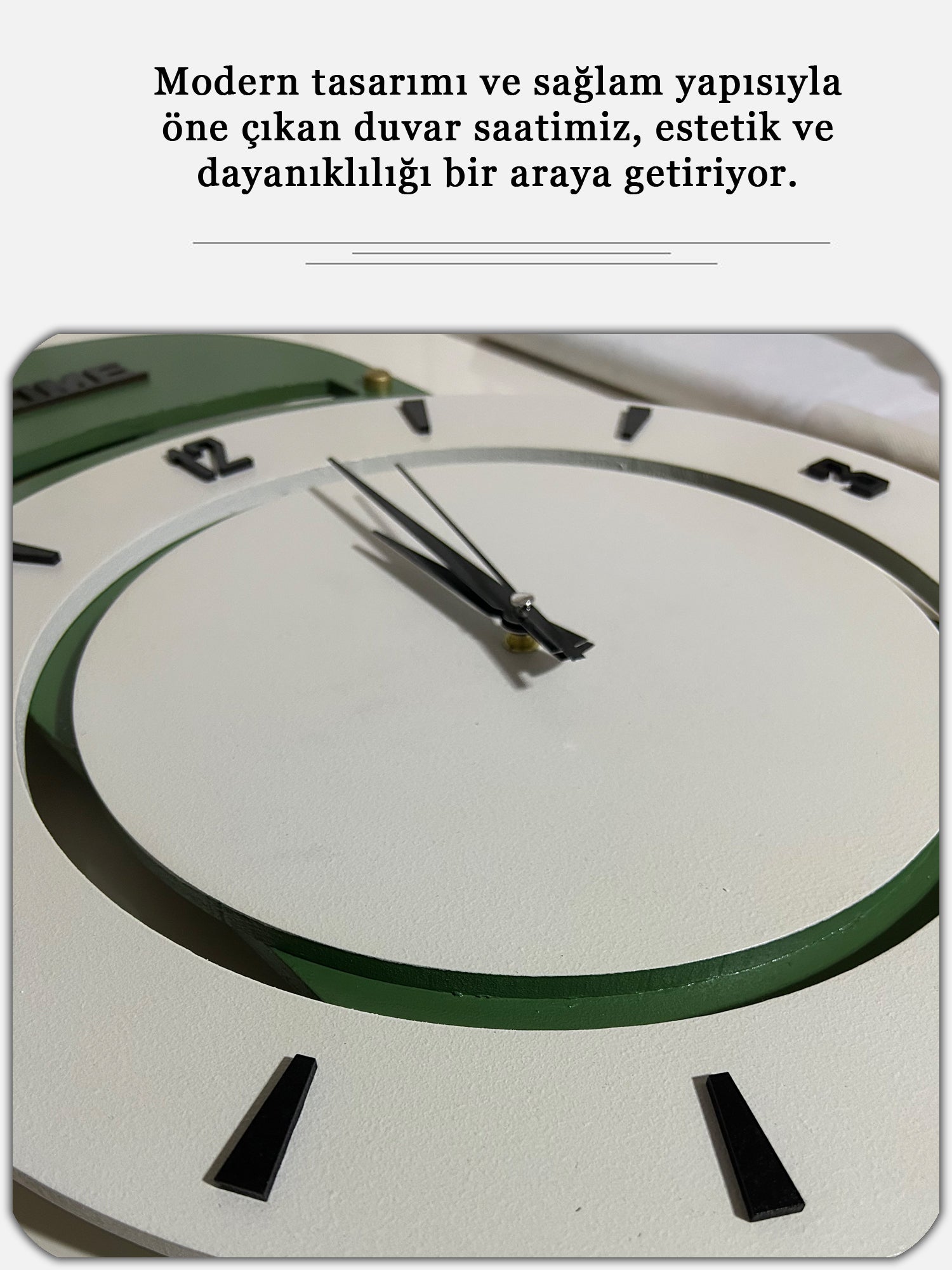 Sade çizgileri ve modern renk geçişleriyle öne çıkan Upsilon Duvar Saati, yeşil, siyah ve altın tonlarının uyumu sayesinde hem klasik hem çağdaş dekorasyonlara sofistike bir dokunuş kazandırır. 50 × 75 cm’lik dikey formu, dar duvarlarda bile tablo etkisi yaratırken sessiz, akar saniyeli mekanizmasıyla huzurlu bir ortam sunar. 8 mm MDF gövde ve güçlü metal profil çerçeve, ürüne uzun ömür ve sağlamlık katar.